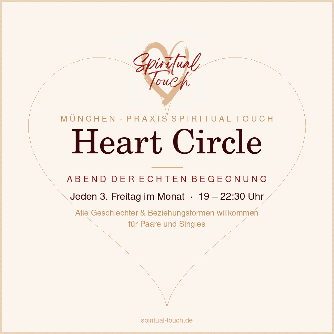 Der Heart Circle ist ein monatlicher Begegnungsabend für Menschen, die echte Verbindung suchen – mit sich selbst und mit anderen. In einem sicheren, von Jörg & Eva Saur angeleiteten Rahmen erkunden wir gemeinsam, was authentische Begegnung wirklich bedeutet: Präsenz, Blickkontakt, das Spüren von Nähe und Grenze, und leichte achtsame Berührung.